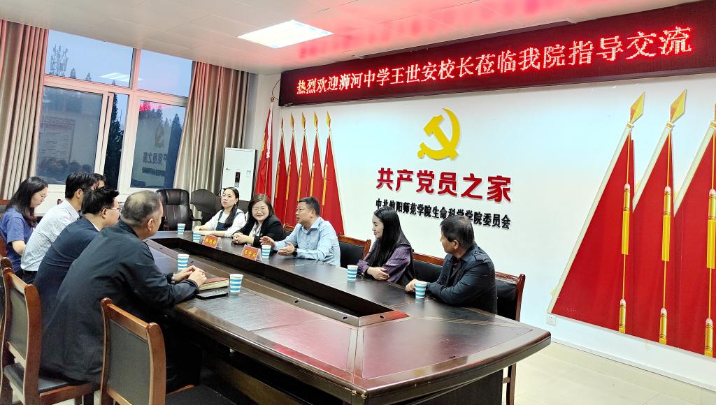 黨委書記李剛對(duì)王世安一行的到來表示熱烈歡迎,簡(jiǎn)要介紹了我院黨建引領(lǐng)教育教學(xué)等方面的做法以及取得突出成效。院長(zhǎng)饒本強(qiáng)介紹了學(xué)院概況、師資隊(duì)伍、教育教學(xué)、科研平臺(tái)和社會(huì)服務(wù)等基本情況,并重點(diǎn)介紹了我院在教師教育、師范專業(yè)、師范生成長(zhǎng)工作坊和鐘秀學(xué)堂等建設(shè)情況。饒本強(qiáng)指出,長(zhǎng)期以來,浉河中學(xué)與生科院在實(shí)習(xí)實(shí)訓(xùn)、學(xué)生支教、教師互動(dòng)交流等方面保持著良好的合作關(guān)系,雙方緊緊圍繞人才共育共培和教育教學(xué)創(chuàng)新開展了一系列的教研活動(dòng),取得了較好成效。王世安校長(zhǎng)對(duì)前期雙方的合作表示高度肯定,他簡(jiǎn)要介紹了浉河中學(xué)的基本情況,以及在人才培養(yǎng)、教育教學(xué)和素質(zhì)教育拓展等方面的做法和成功經(jīng)驗(yàn)。雙方就新形勢(shì)下中學(xué)生素質(zhì)教育、師范生成長(zhǎng)和教育實(shí)踐基地共建等設(shè)想進(jìn)行了深入探討交流,并達(dá)成合作共識(shí)。