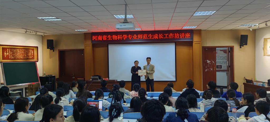 講座開始前,彭波為魏虹娣頒發(fā)河南省生物科學專業(yè)師范生成長工作坊的坊主聘書。隨后,魏老師從自我介紹、教育觀念、專業(yè)背景、人文關注等四方面講解了優(yōu)質(zhì)課匯報的注意事項;同時,她分享了一些關于如何打開嗓音的小技巧,以提升同學們的課堂表達能力。最后,魏老師詳細闡述了教師的自我發(fā)展成長路徑,她談到一個達標教師成長到骨干教師、優(yōu)秀教師、卓越教師分別需要具備的能力,希望同學們在校培養(yǎng)扎實的專業(yè)基礎能力,專業(yè)基礎能力是未來成為優(yōu)秀教師的重要保障。講座結(jié)束后,同學們積極向魏老師提問,魏老師也認真耐心地進行了解答,現(xiàn)場交流氣氛十分熱烈。
