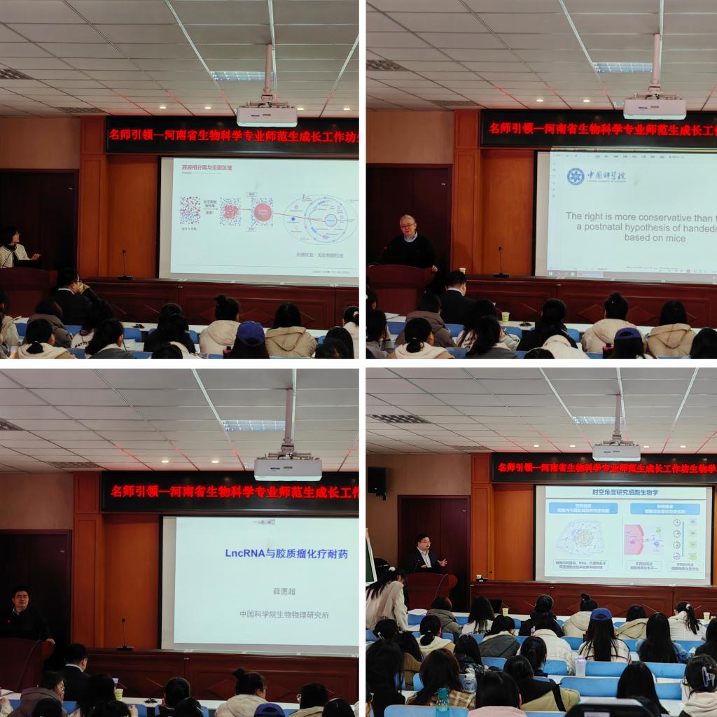 11月22日上午,應(yīng)河南省生物科學(xué)專業(yè)師范生成長工作坊邀請,來自中國科學(xué)院孫中生、薛愿超和李幸研究員以及北京大學(xué)李婷婷教授在生科樓414報告廳為師范生成長工作坊的同學(xué)們作了RNA領(lǐng)域及相關(guān)領(lǐng)域的最新研究報告。系列專題報告會由院長饒本強教授主持,工作坊坊主和師范生成長工作坊本科生及研究生聆聽了報告。