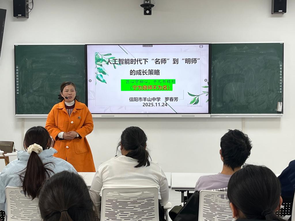 荊勝利副院長主持開場。信陽市羊山中學高級教師、中原名師羅春芳作題為《智能時代下“名師”到“明師”成長策略》的專題報告。她結(jié)合教學實踐,指出生物教育在智能時代的發(fā)展趨勢,強調(diào)師范生既要扎實專業(yè)基礎(chǔ),也要善用虛擬仿真、項目式學習等數(shù)字化手段提升教學效果。她勉勵學生:“‘明師’應(yīng)明晰育人初心,既要傳授知識,更要培養(yǎng)學生的科學思維與生命觀念。”