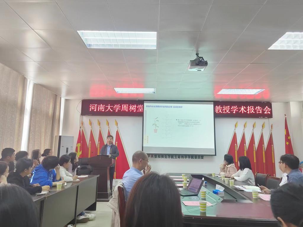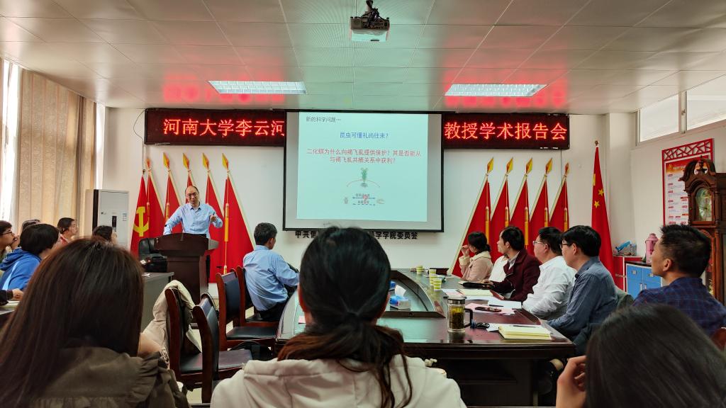 2023年3月9日上午,應(yīng)生命科學(xué)學(xué)院邀請,河南大學(xué)周樹堂教授和李云河教授在生物樓412會議室,分別做了題為“昆蟲高生殖力的遺傳基礎(chǔ)與分子調(diào)控機(jī)制解析”和“二化螟與褐飛虱協(xié)作應(yīng)對水稻抗蟲防御的生態(tài)和分子機(jī)制”的學(xué)術(shù)報告,我院青年教師及部分學(xué)生聆聽了報告。報告會由院長饒本強(qiáng)教授主持。