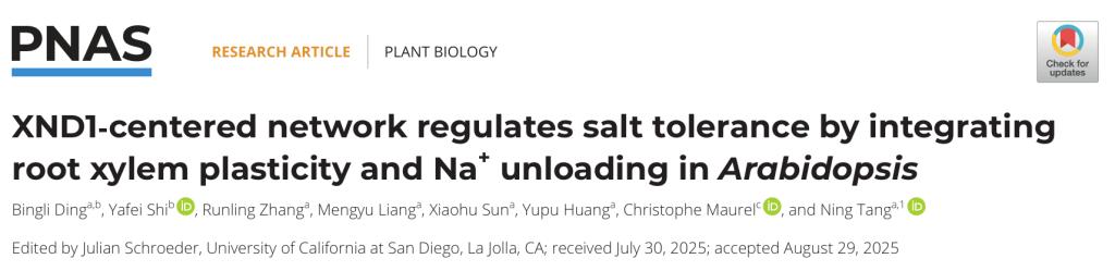 10月25日,國際知名學(xué)術(shù)期刊《PROCEEDINGS OF THE NATIONAL ACADEMY OF SCIENCES OF THE UNITED STATES OF AMERICA》(PNAS,五年影響因子10.6)在線刊發(fā)了我院丁炳莉博士等人題為“XND1-centered network regulates salt tolerance by integrating root xylem plasticity and Na+unloading inArabidopsis”的研究論文。