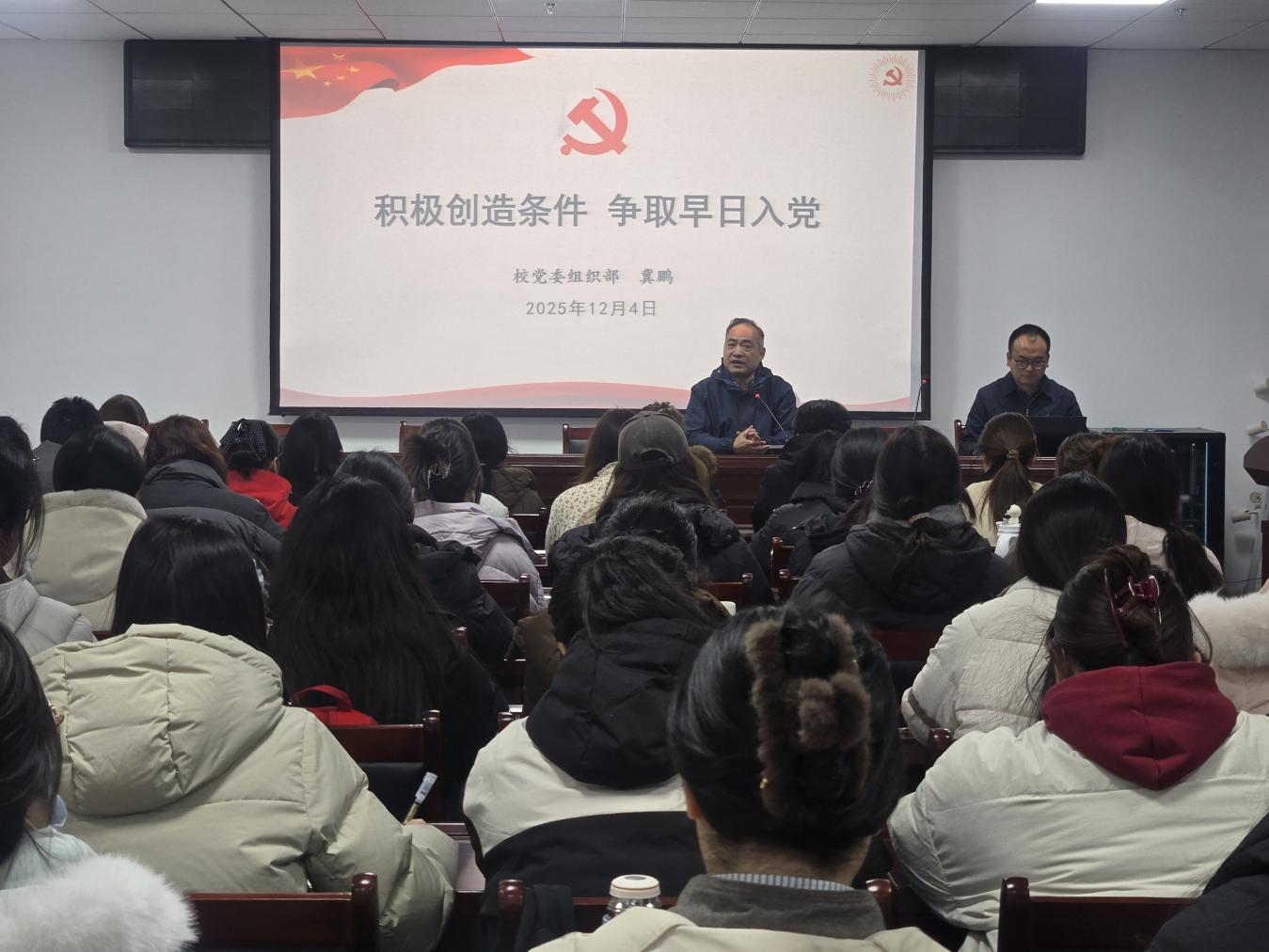 2025年12月4日,生命科學學院邀請校黨委組織部副部長冀鵬為學院分黨校2025年下半年入黨積極分子培訓班全體學員作題為《積極創(chuàng)造條件,爭取早日入黨》的專題輔導報告,報告會由黨委書記李剛主持。