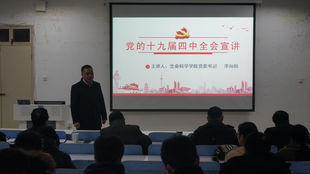 為深入學(xué)習(xí)和貫徹黨的十九屆四中全會精神,推進(jìn)我院黨委工作高效有序進(jìn)行,12月24日,我院于生物樓414會議室開展黨的十九屆四中全會宣講會議。黨委書記李向陽,院長袁紅雨,黨委副書記楊霽虹,黨委副書記、副院長宋新強,黨委委員、副院長張海賓,紀(jì)檢委員、遺傳研究所副所長饒本強共同參加此次會議。會議由李向陽主講。