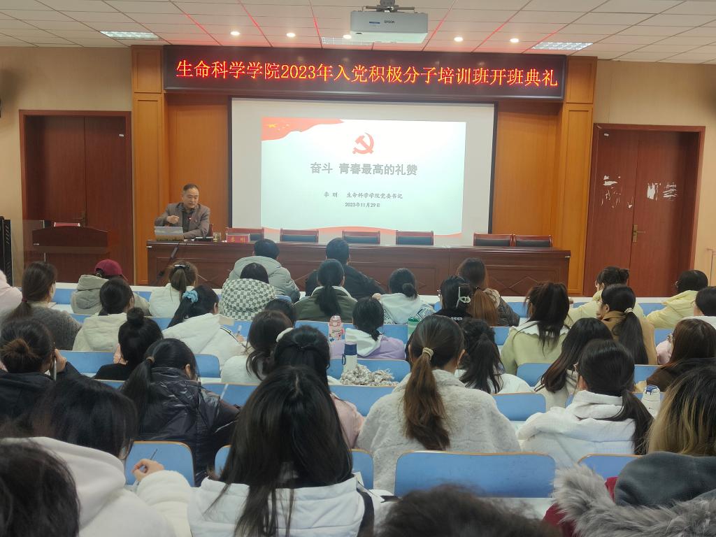 為深入學(xué)習(xí)貫徹習(xí)近平新時代中國特色社會主義思想,貫徹落實(shí)黨的二十大精神,切實(shí)做好入黨積極分子教育培養(yǎng)工作,充實(shí)黨員隊(duì)伍后備力量,提高黨員發(fā)展質(zhì)量,嚴(yán)把黨員“入口關(guān)”。11月29日晚,生命科學(xué)學(xué)院分黨校2023年入黨積極分子培訓(xùn)班開班典禮在生科樓414報(bào)告廳舉行。院黨委書記李剛、黨委副書記榮憲舉,學(xué)生黨支部書記及76名入黨積極分子學(xué)員參加開班典禮。