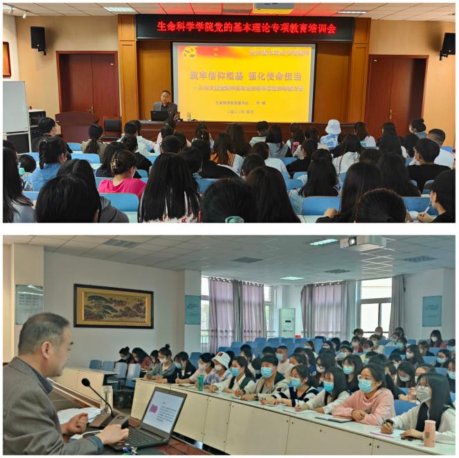 為確保師生黨員對(duì)黨的最新理論成果特別是黨的指導(dǎo)思想認(rèn)識(shí)到位,生命科學(xué)學(xué)院黨委于4月21日晚在生科樓414報(bào)告廳召開專題黨課就黨的基本理論進(jìn)行專項(xiàng)教育培訓(xùn)。學(xué)院黨委書記李剛以“筑牢信仰根基 強(qiáng)化使命擔(dān)當(dāng)——從偉大建黨精神汲取黨的指導(dǎo)思想的磅礴力量”為題,帶領(lǐng)學(xué)生黨支部書記和全體預(yù)備黨員在重溫革命故事、感悟信仰力量中對(duì)黨的基本理論和指導(dǎo)思想進(jìn)行再教育再培訓(xùn)。